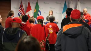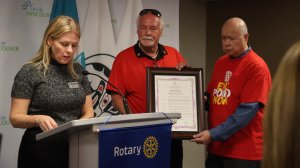 | Vancouver City Councillor Rebecca Bligh speaks to Rotarians at City Hall for the ceremony to start the walk or polio | Councillor Rebecca Bligh reads the City of Vancouver proclamation to mark World Polio Day as Immediate Past District Governor Drew Antrobus and Matt Caparas hold the proclamation |